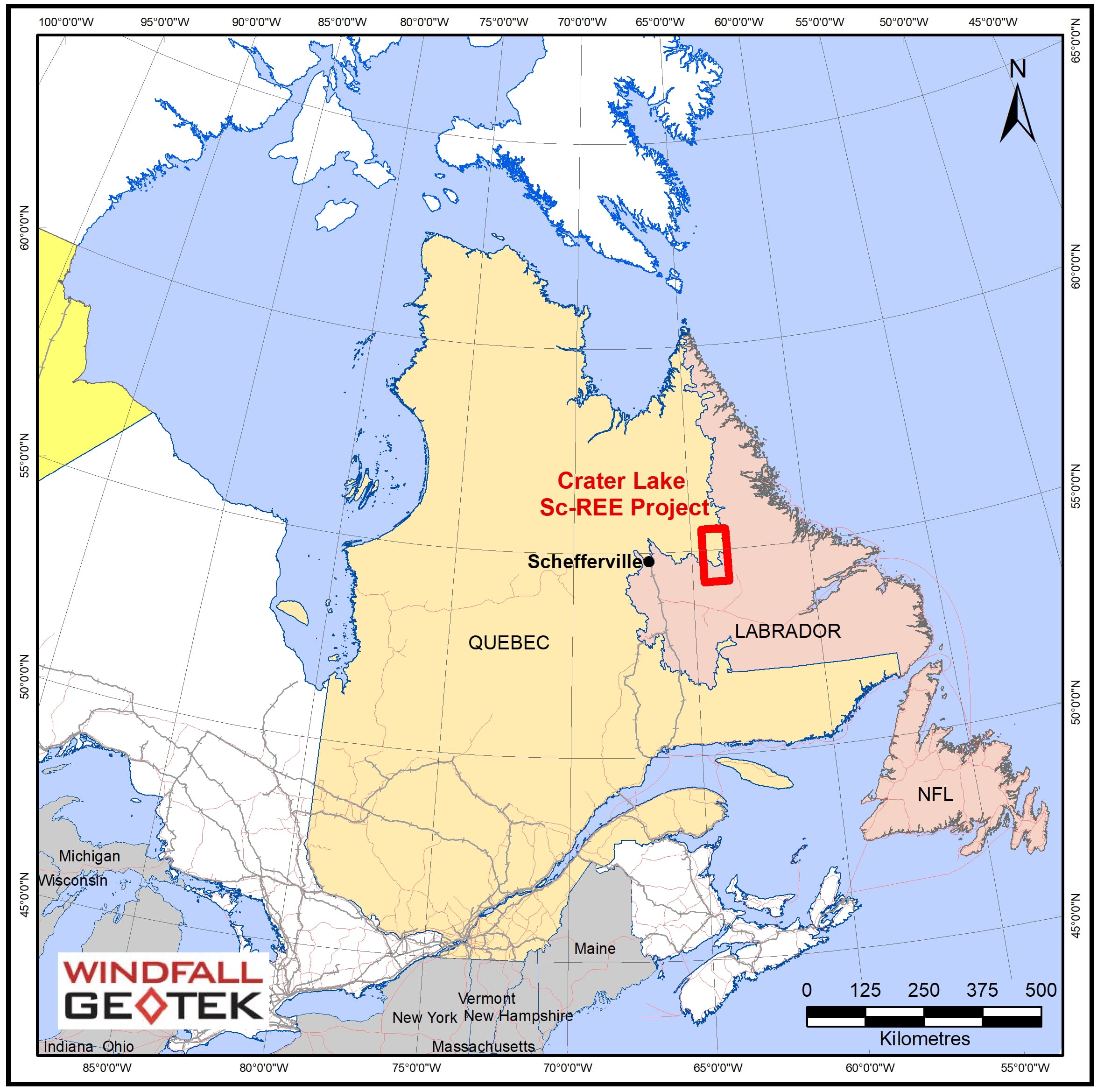 Crater Lake scandium (Sc)-REE Internal Project is located near the Quebec-Labrador provincial border, approximately 200 km northeast of the city of Schefferville (QC). This Project lies within the Mistastin Batholith which is composed of biotite and hornblende rich granite, biotite and hornblende rich monzonite, quartz syenite-quartz monzonite, and biotite and hornblende rich quartz syenite. The large ferro-syenite bodies are elongated and concordant to subconcordant to the main contact between the Crater Lake syenite and the Mistastin granite intrusions. Three large ferro-syenite bodies have been found on the property namely TGZ, Boulder Lake and STG.